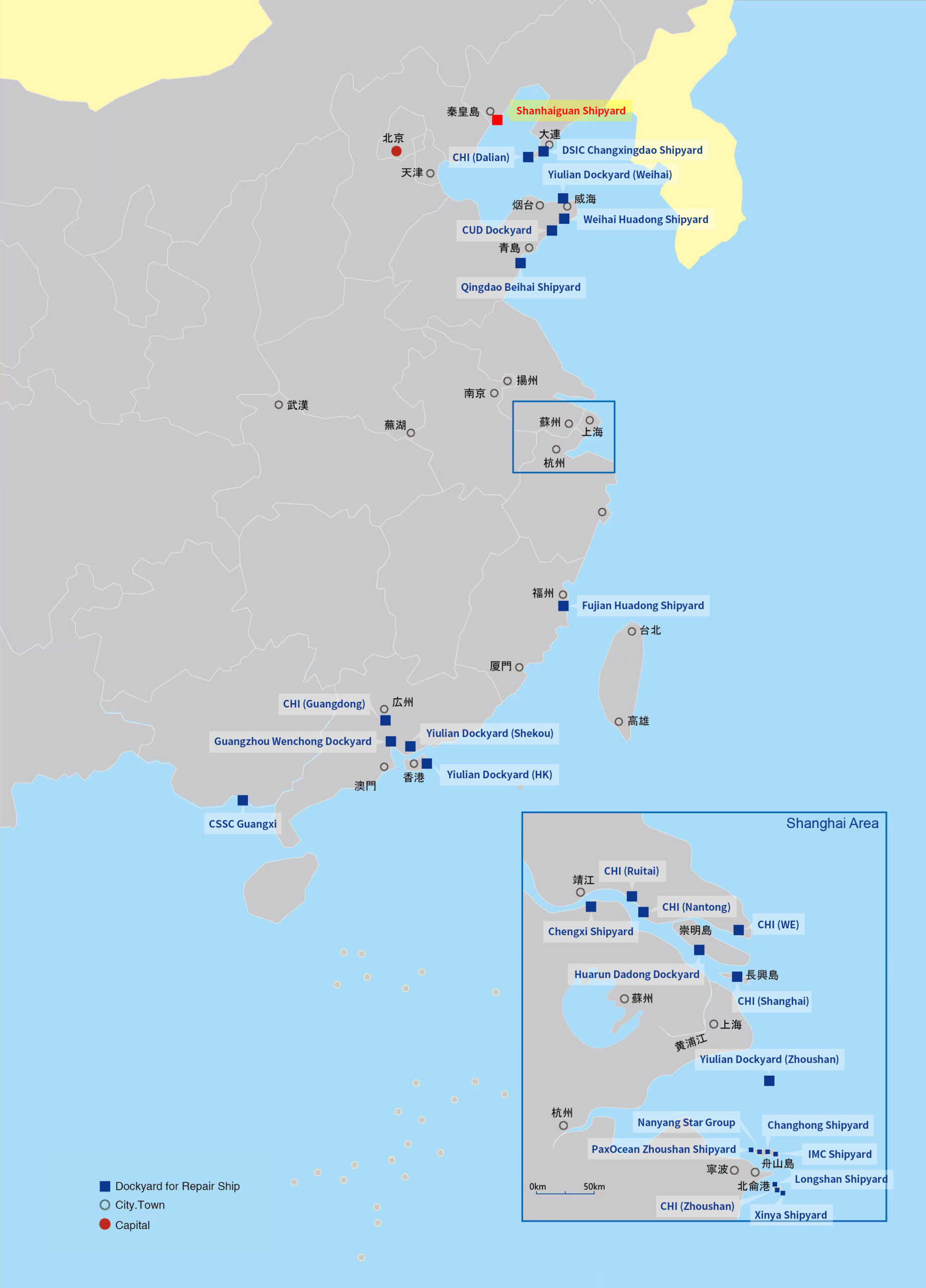 | CSSC-Guangxi (N21°36′E108°40′) | F | 247.2 × 39.8 | >100,000 | 22T, 5T | Panamax size |